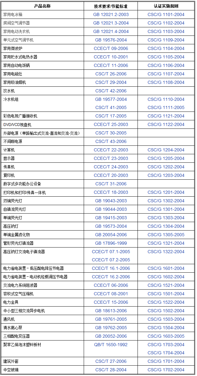 節(jié)能產(chǎn)品認(rèn)證依據(jù)的技術(shù)要求或相關(guān)能效標(biāo)準(zhǔn)以及認(rèn)證實施規(guī)則如下表: