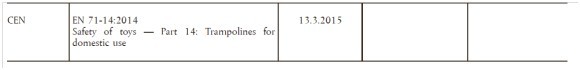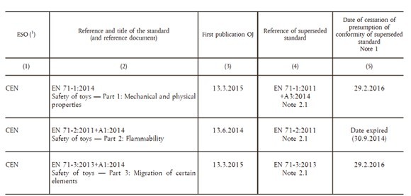 歐盟于2015年3月13日正式發(fā)布關(guān)于EN 71-1:2014、EN71-3:2013 + A1 2014 和EN 71-14:2014正式成為新玩具指令2009/48/EC協(xié)調(diào)標(biāo)準(zhǔn)的官方公告。舊版本標(biāo)準(zhǔn)(EN71-3:2013 和 EN71-1:2011+A3:2014)將于2016年2月29日被正式取代。
